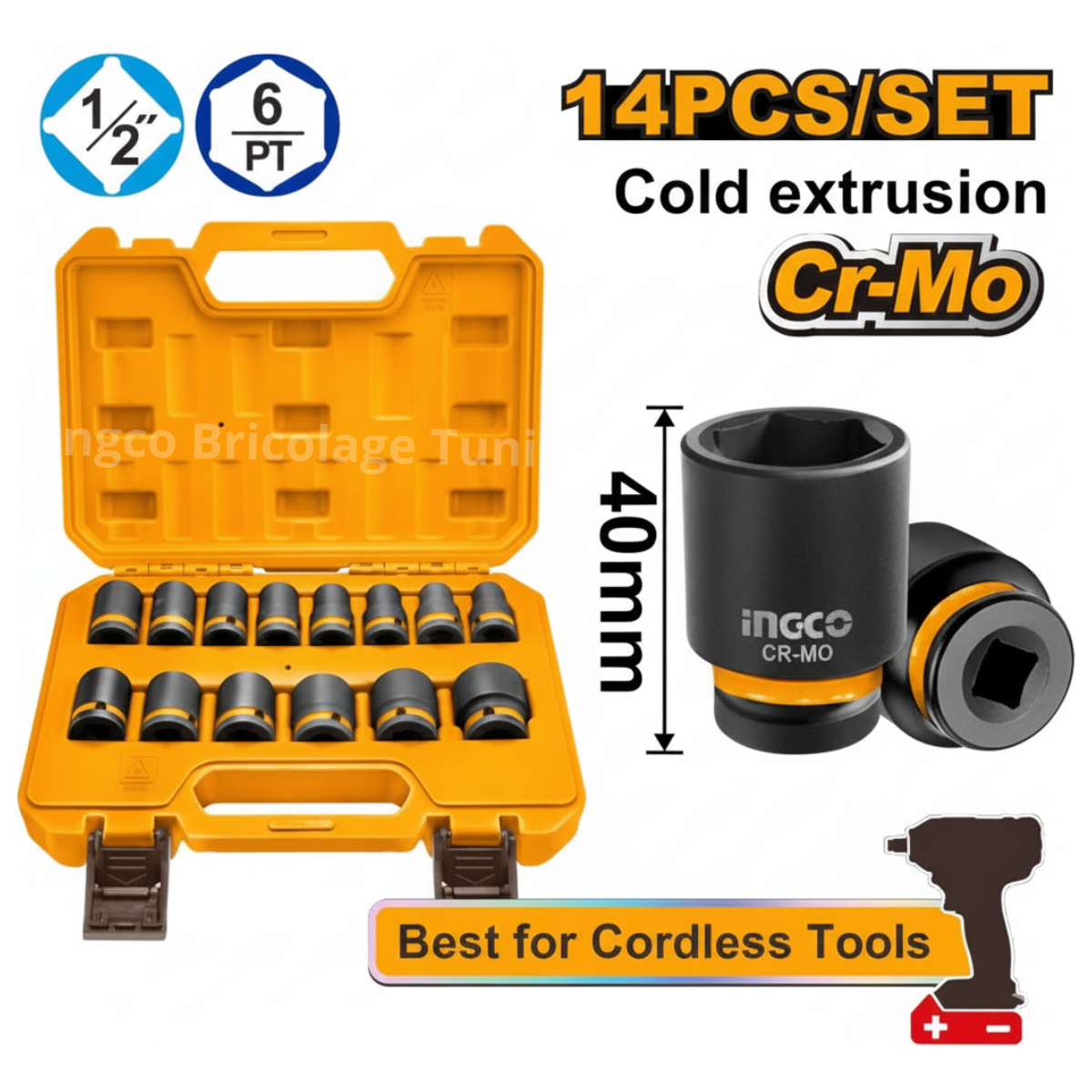 14 douilles hexagonales 1/2″ : 10-11-12-13-14-15-17-19-21-22-24-27-30-32 mm